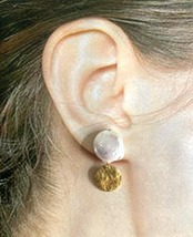淡水コインパールとゴールドカラーのパーツを組み合わせたピアスです。コインパールは直径約1.2cm、エレガントなデザインに仕上がりました。