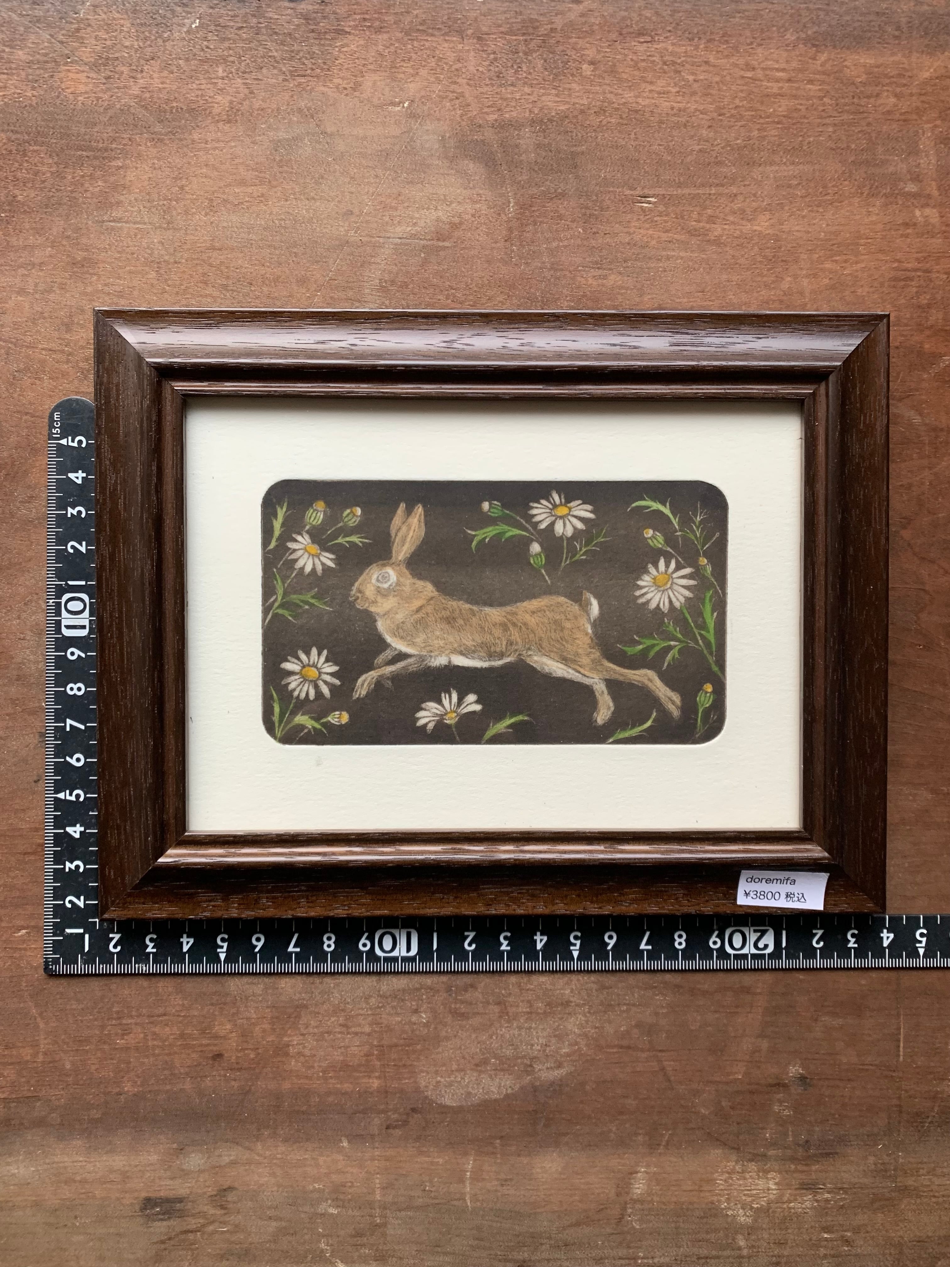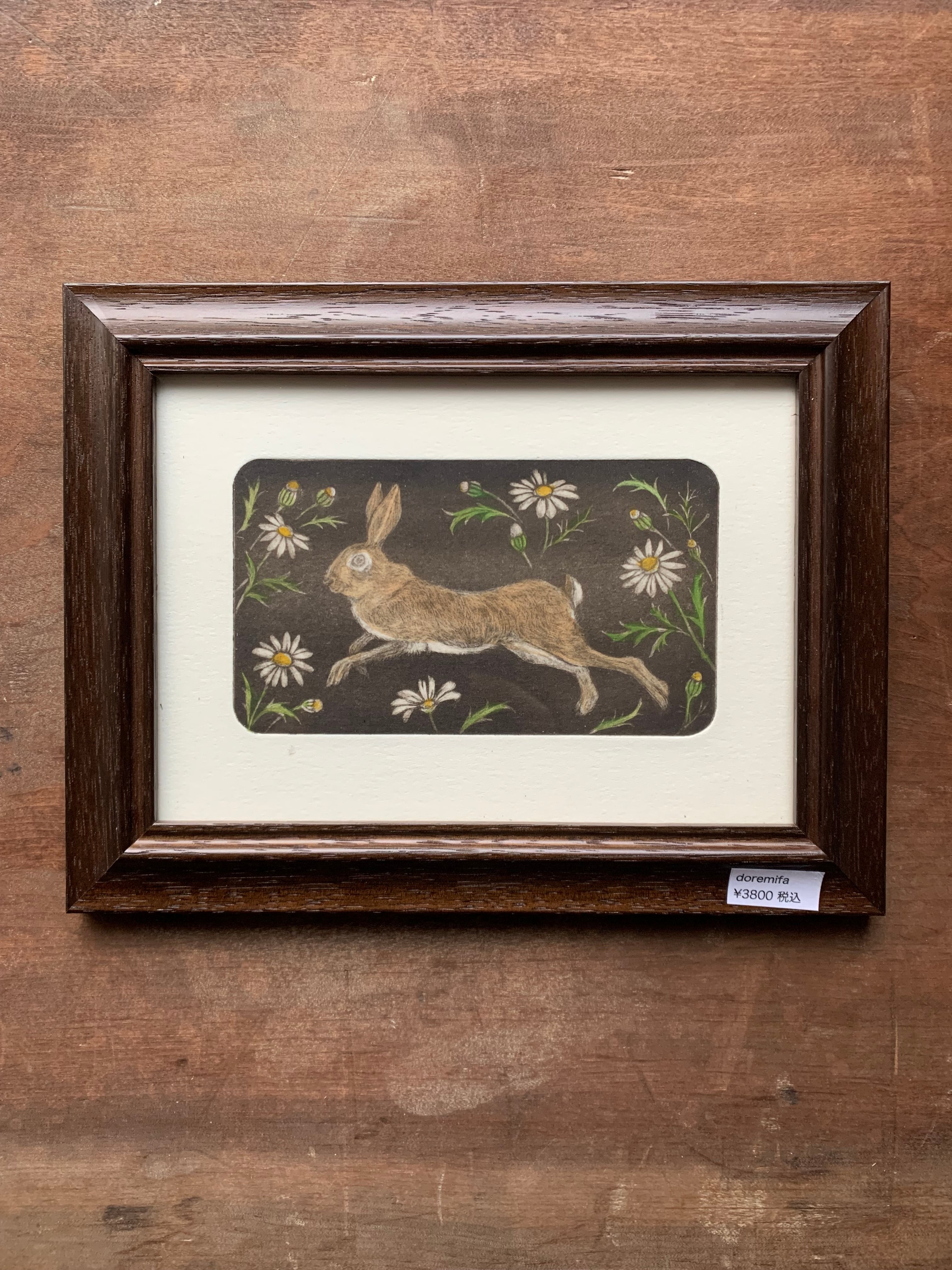 店主制作のメゾチント銅版画作品。野うさぎとカモミールの花をモチーフにした一枚です。メゾチントという技法で制作、プレス機で一枚一枚手刷りした後、着彩したアートピース。