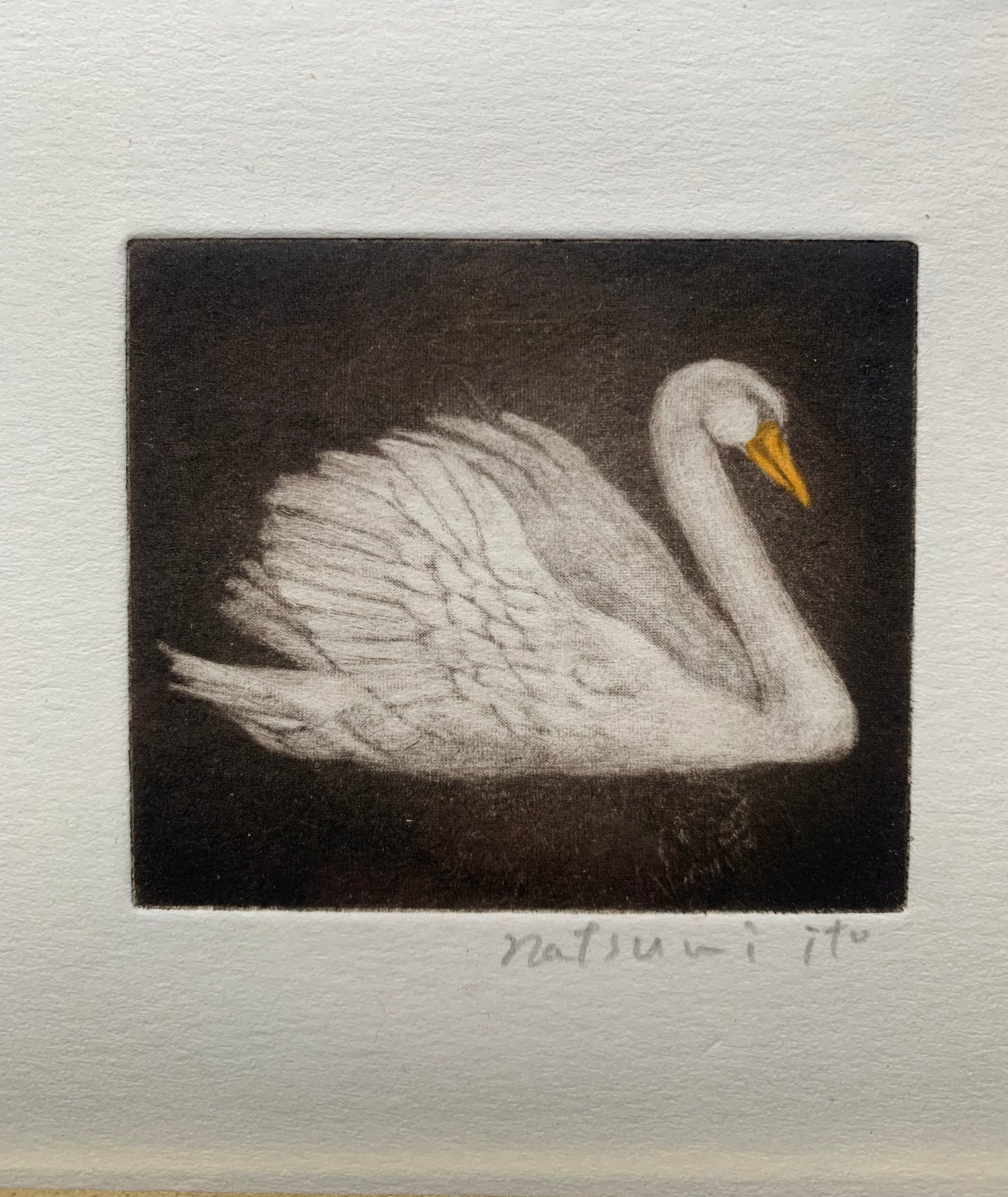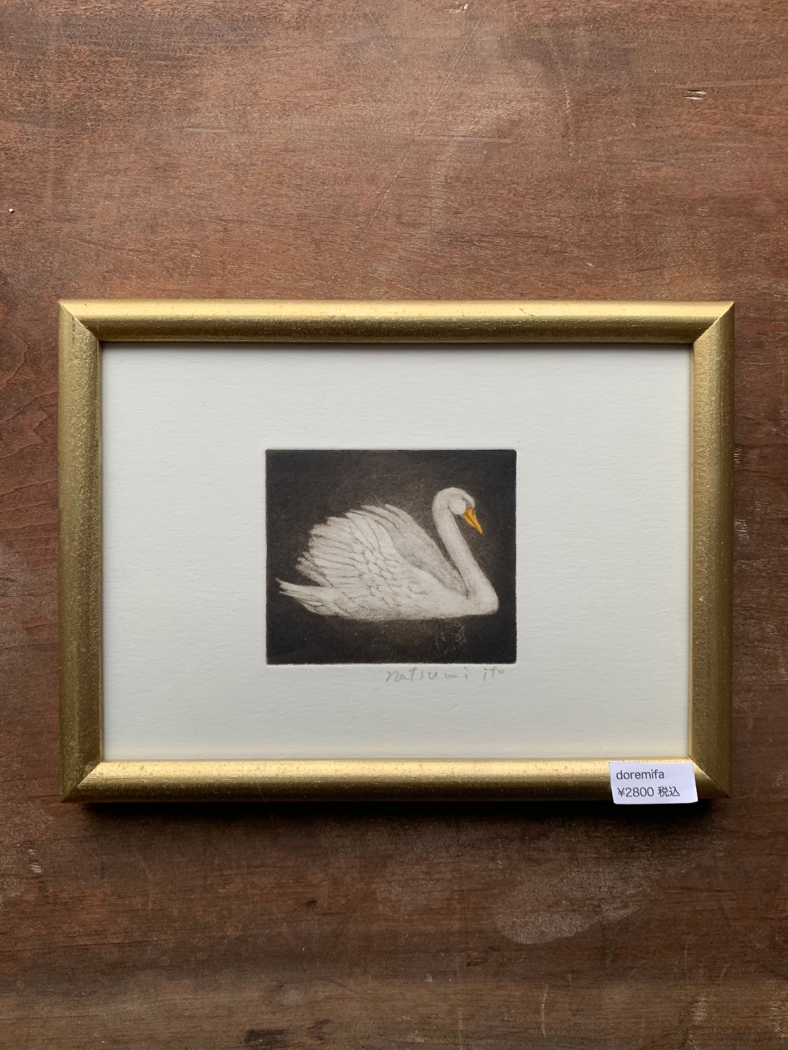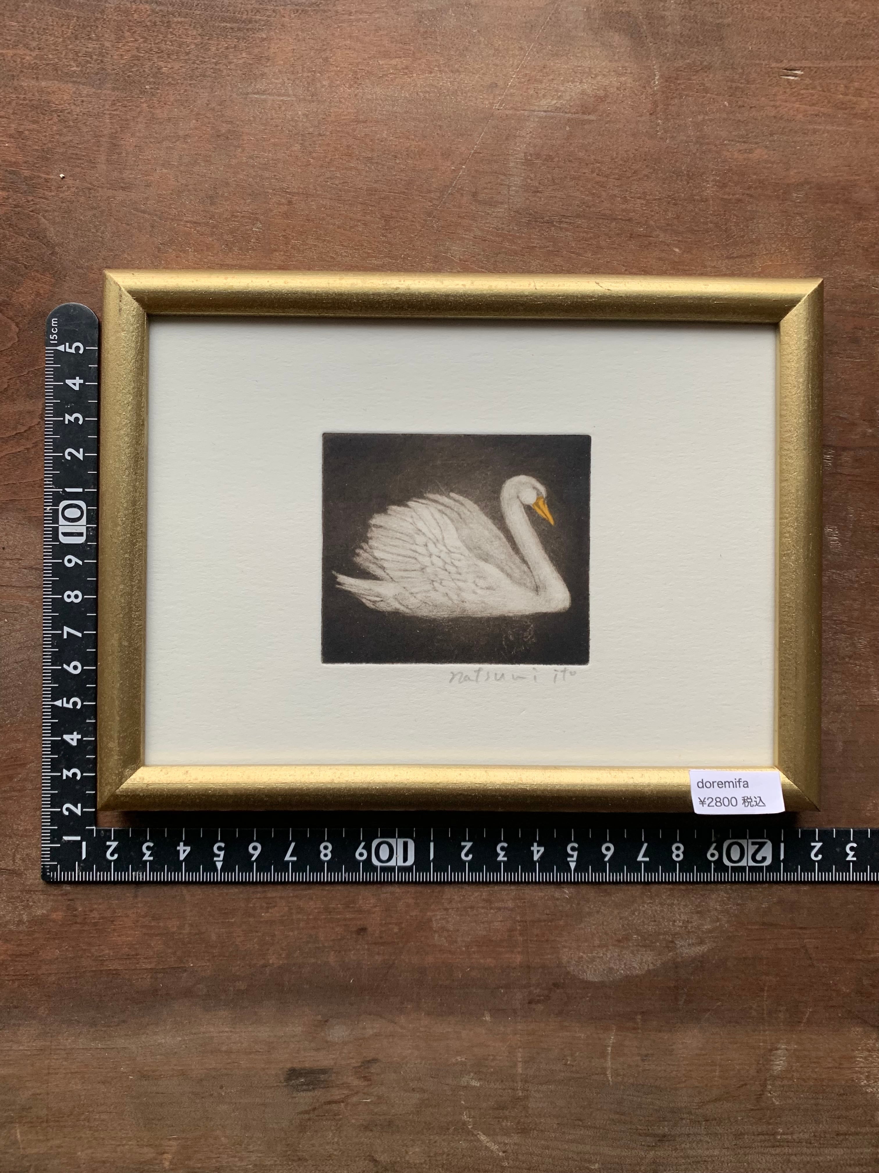 店主制作のメゾチント銅版画作品。白鳥をモチーフにした一枚です。メゾチントという技法で制作、プレス機で一枚一枚手刷りした後、着彩したアートピース。