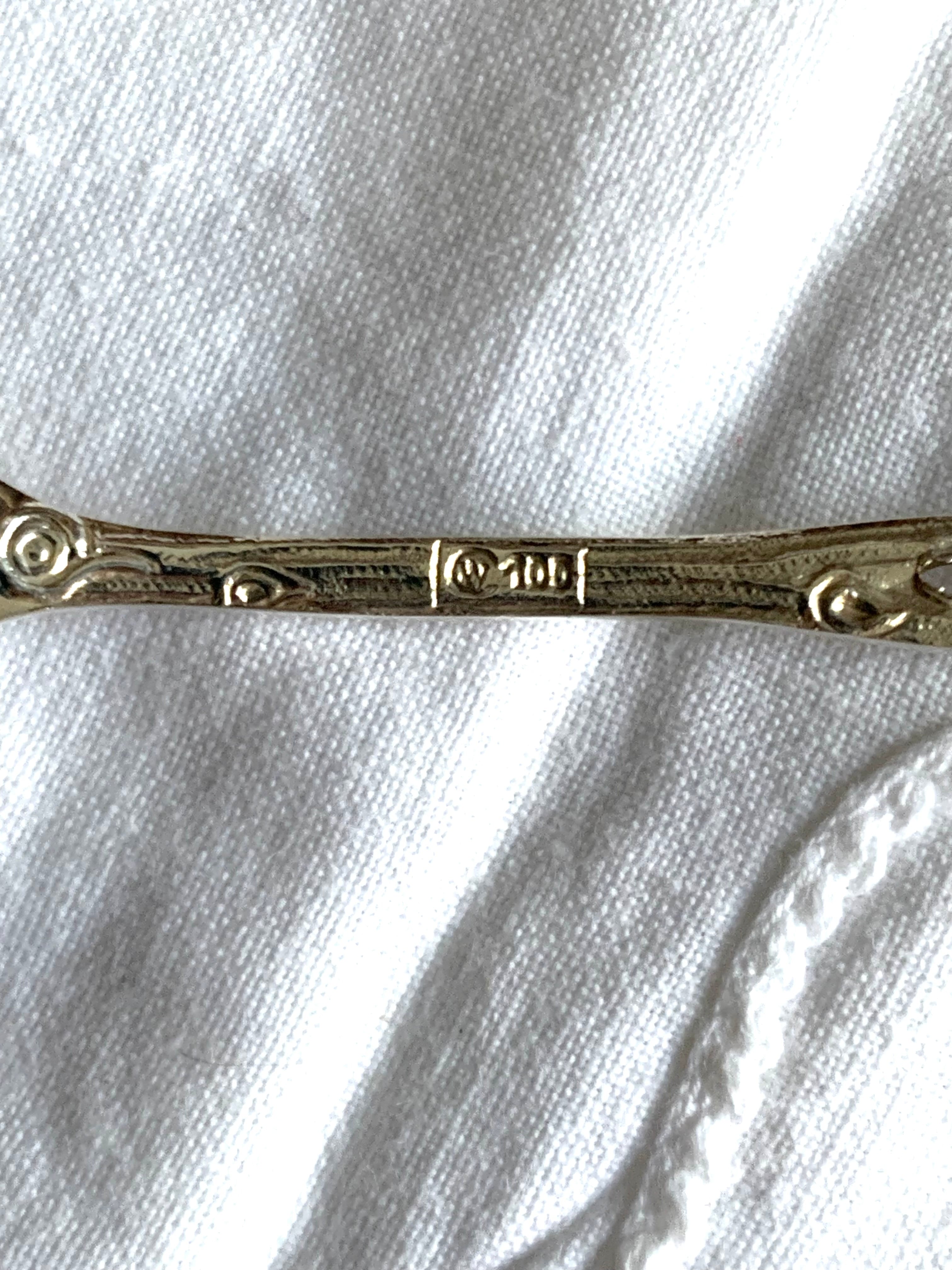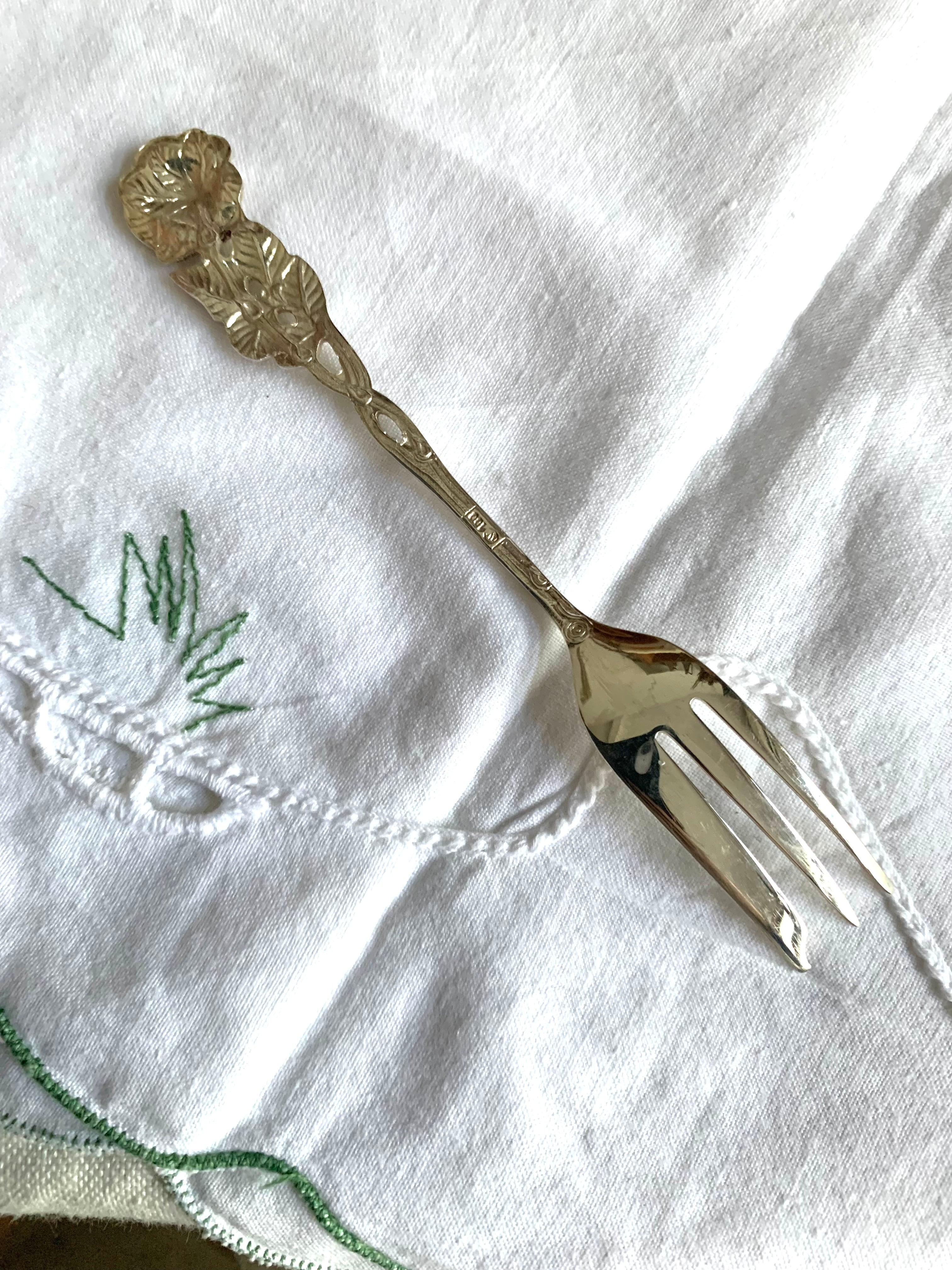 ドイツから届いたヒルデスハイムローズのデザートフォーク 長さ14cm。持ち手の装飾が可愛らしいデザインです。