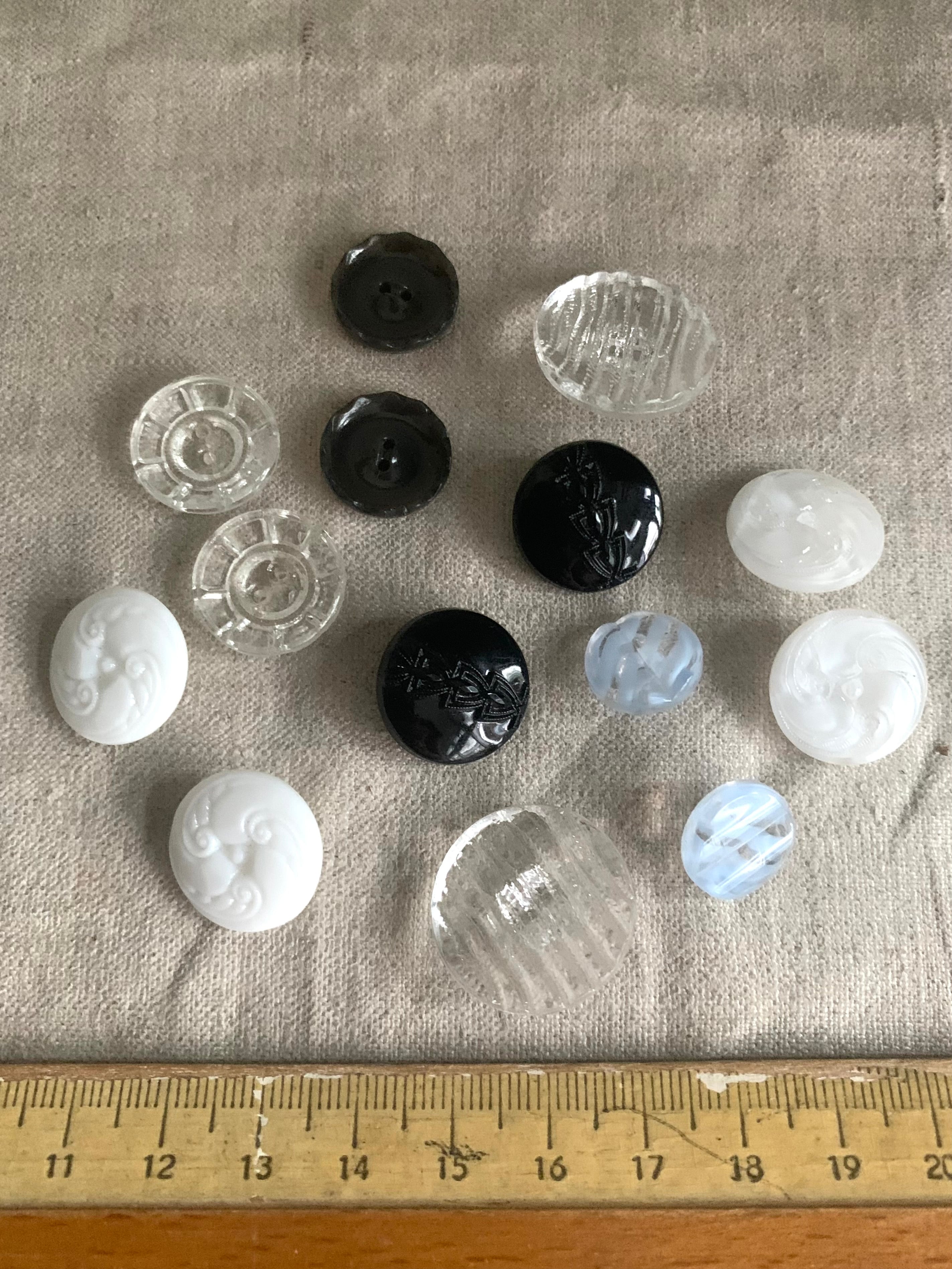 ドイツから届いた、ビンテージのガラスボタンセットです。レトロでモノトーンなボタンを選んでみました。アクセサリーにしたり、シャツの袖だけボタンを付け替えてもかわいいかもしれません。