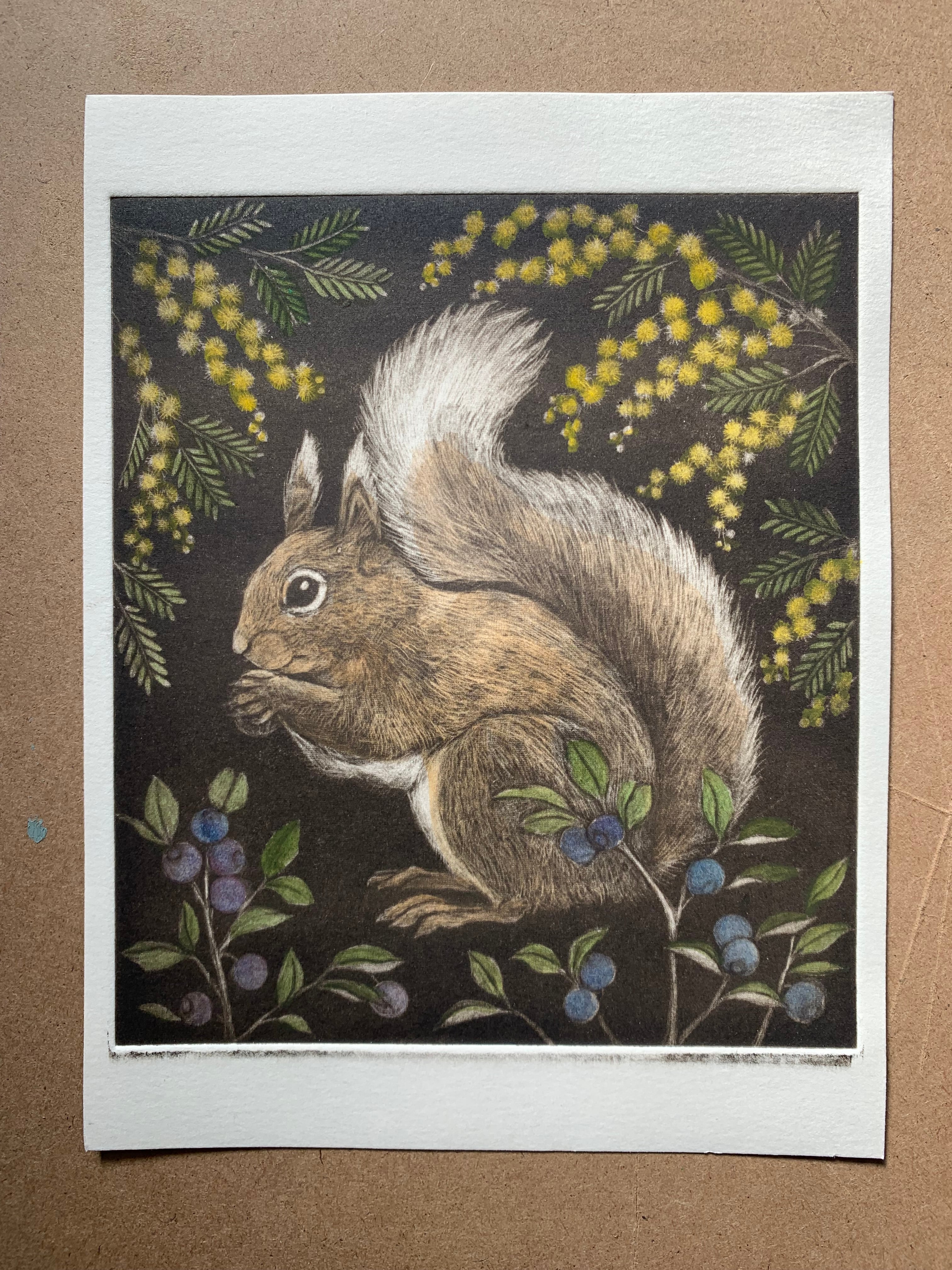 店主制作の銅版画作品。リスとミモザをモチーフにしています。メゾチントという技法で制作、プレス機で一枚一枚手刷りし、着彩したアートピースです。厚紙封筒でお送りいたします。